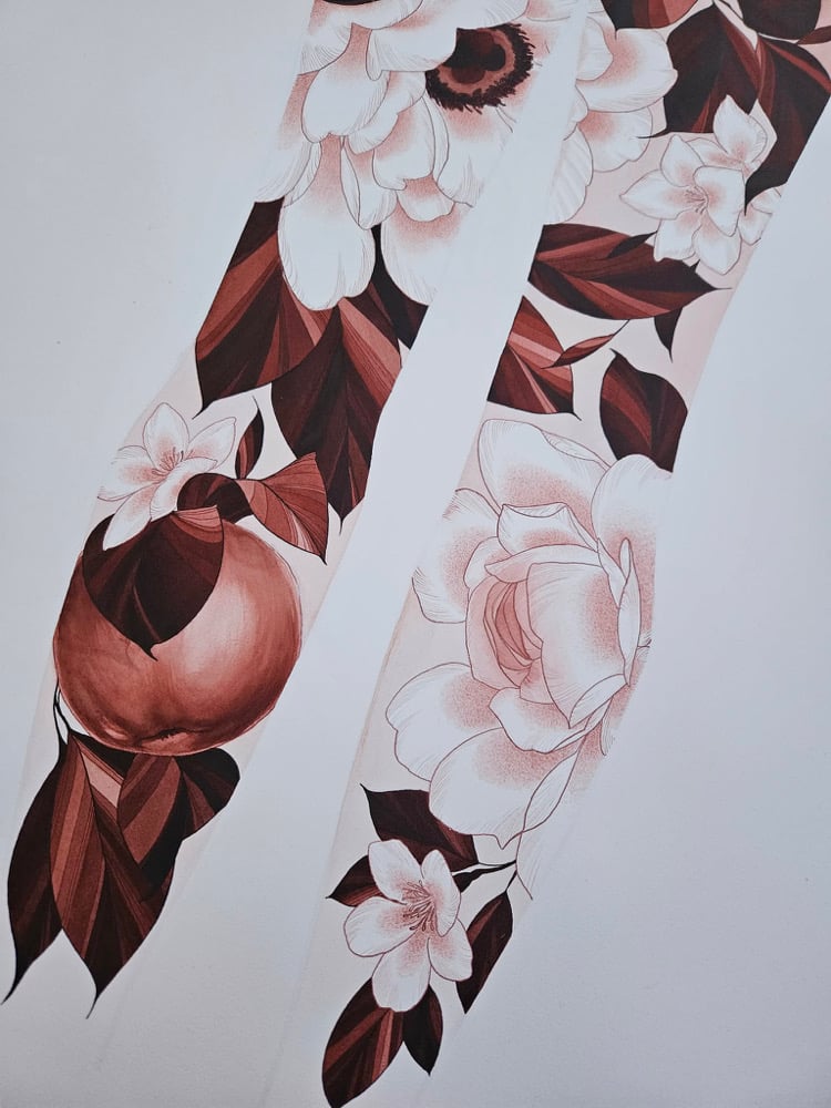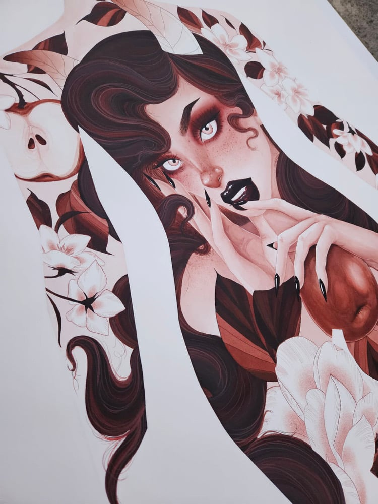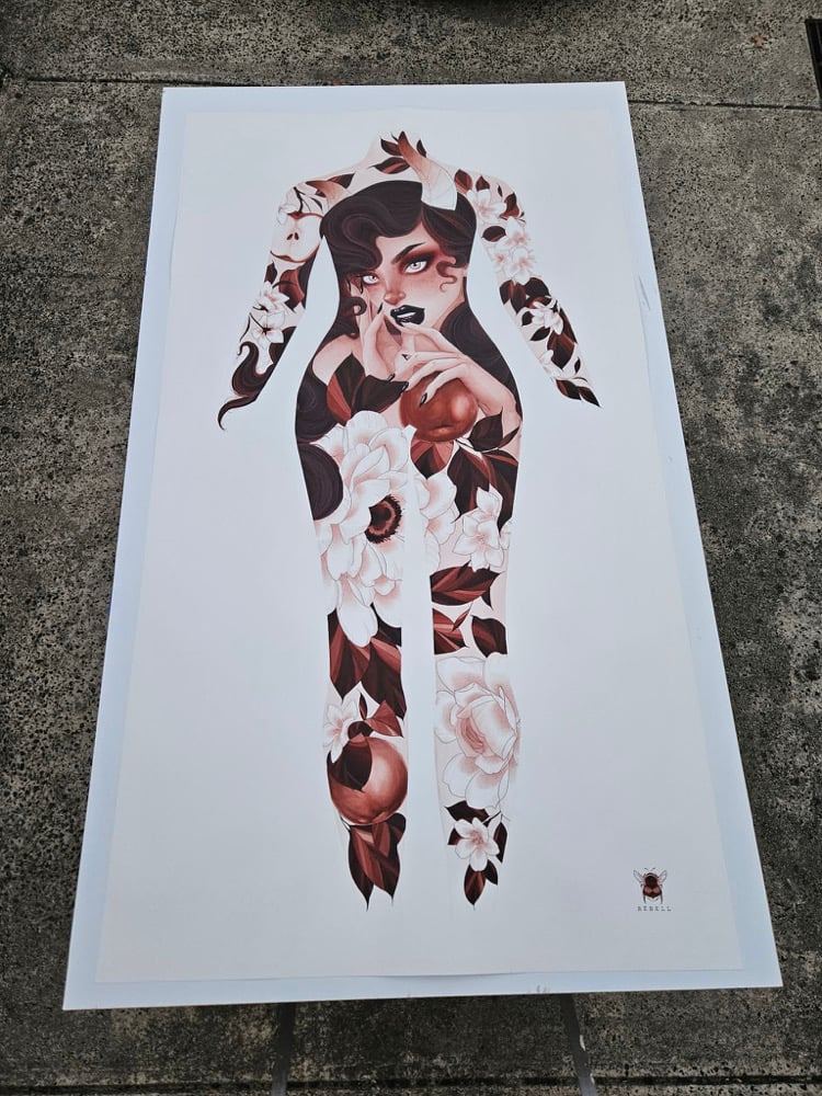 This design is an original hand painted piece, made using just pigment ink on paper at an almost life sized dimension but scanned in and scaled to an A3 format.